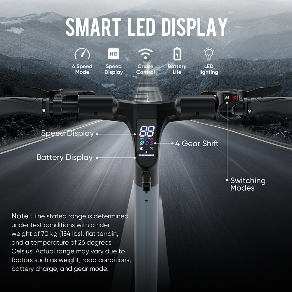 Smart LED Display: Clear and modern interface shows speed, battery status, gear level, and cruise mode at a glance.