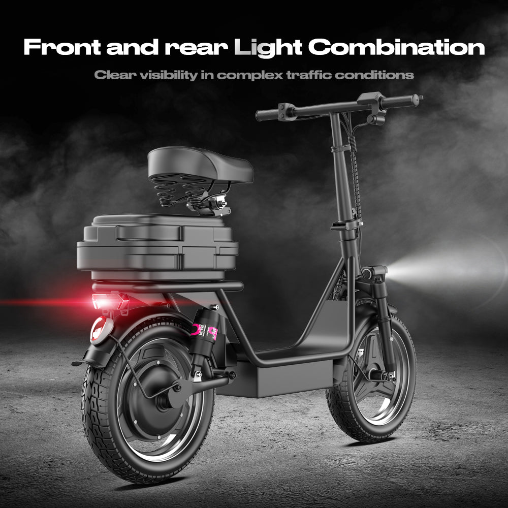 Ergonomic Seat & Storage Box: Features a cushioned seat for added comfort and a sturdy rear cargo box for carrying essentials.