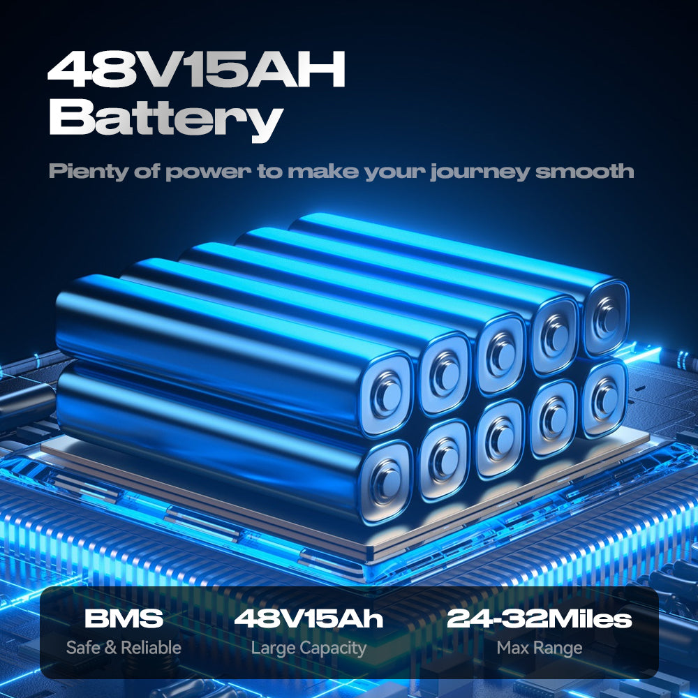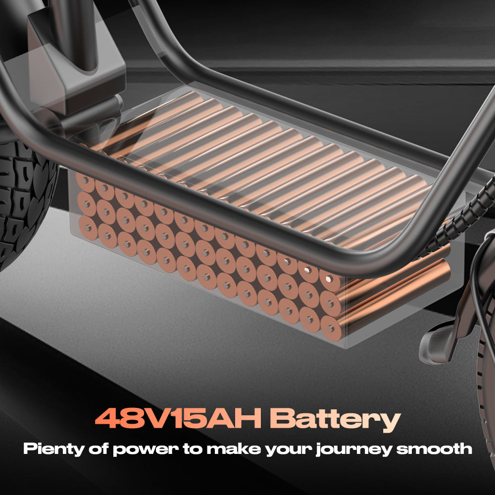 48V 15Ah Long-Range Battery: Provides up to 45–50 km (28–31 miles) per charge, ensuring longer trips with consistent power output.