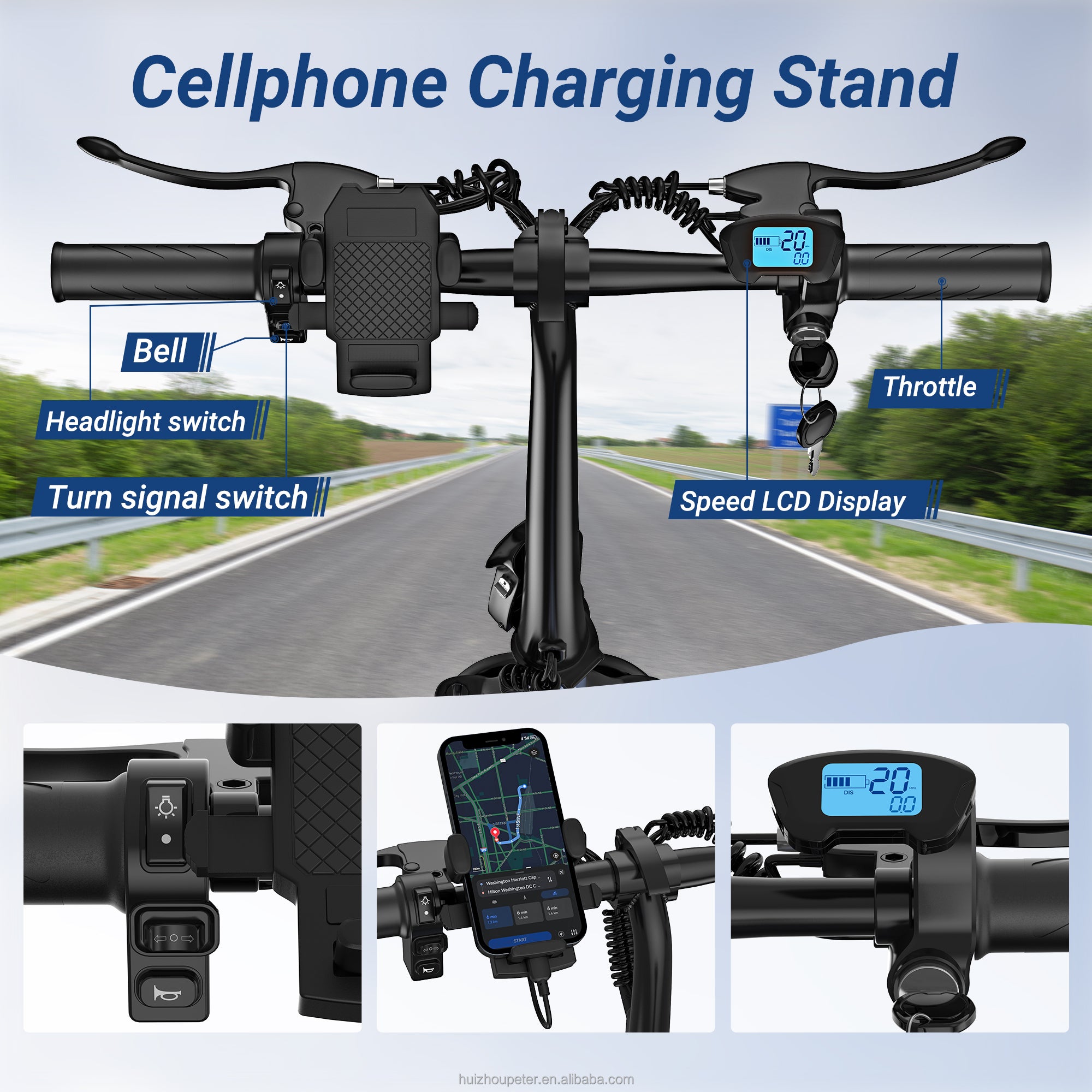 LCD display screen, displaying battery level, speed, and mileage