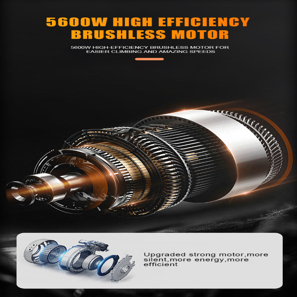 5600W Dual Motor System (2800W × 2): The GT08 features dual high-torque hub brushless motors that deliver incredible acceleration and power. With a top speed of up to 85 km/h (52 mph), it handles steep climbs up to 45° effortlessly.