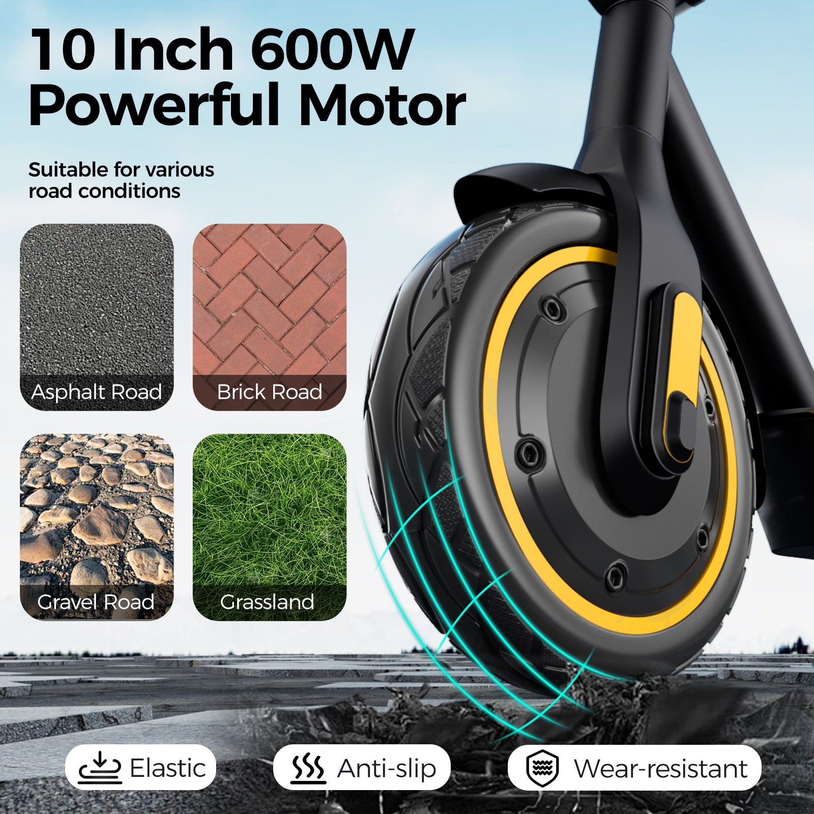 10-Inch Vacuum Tires: Pneumatic air-filled tires offer superior shock absorption, traction, and stability on all road types.