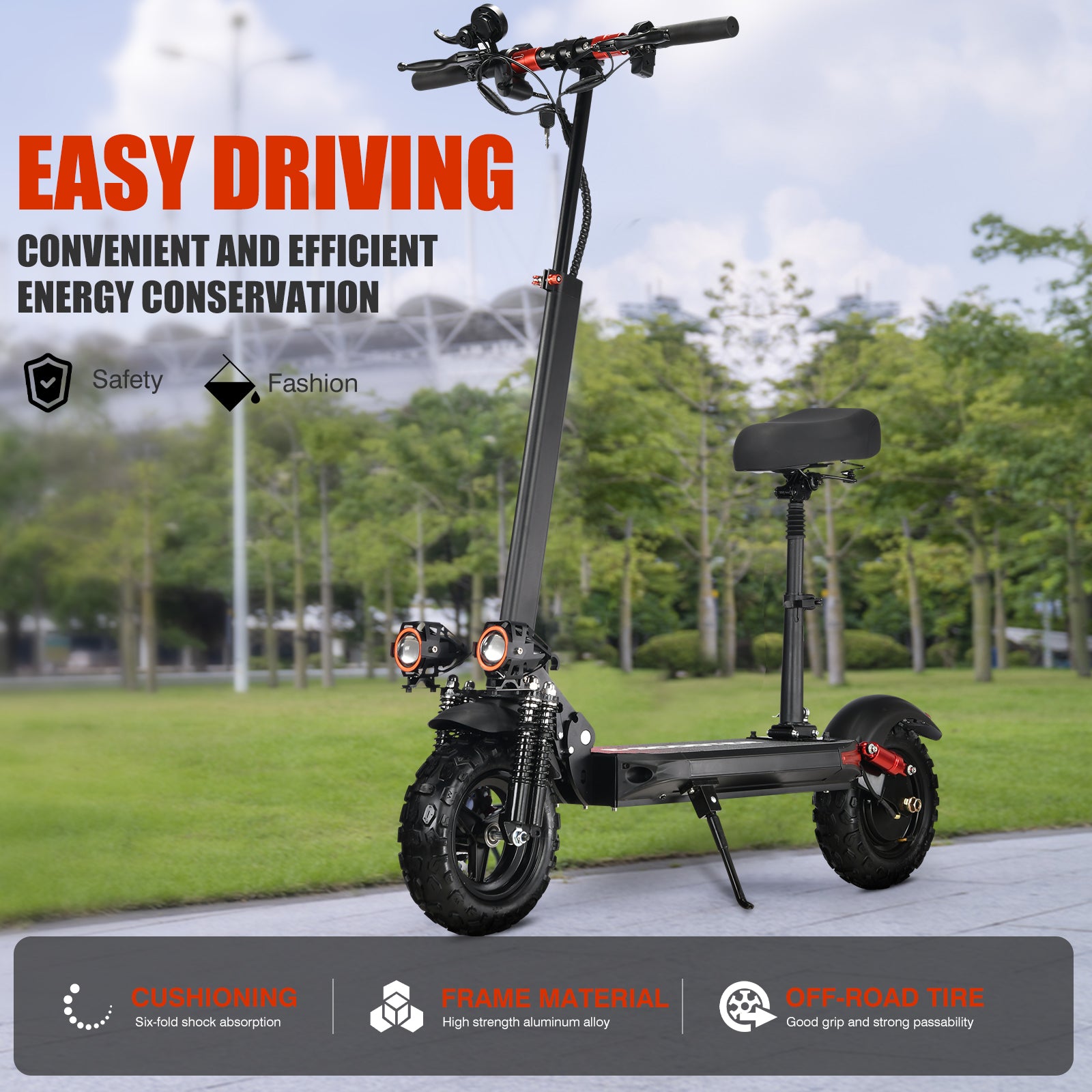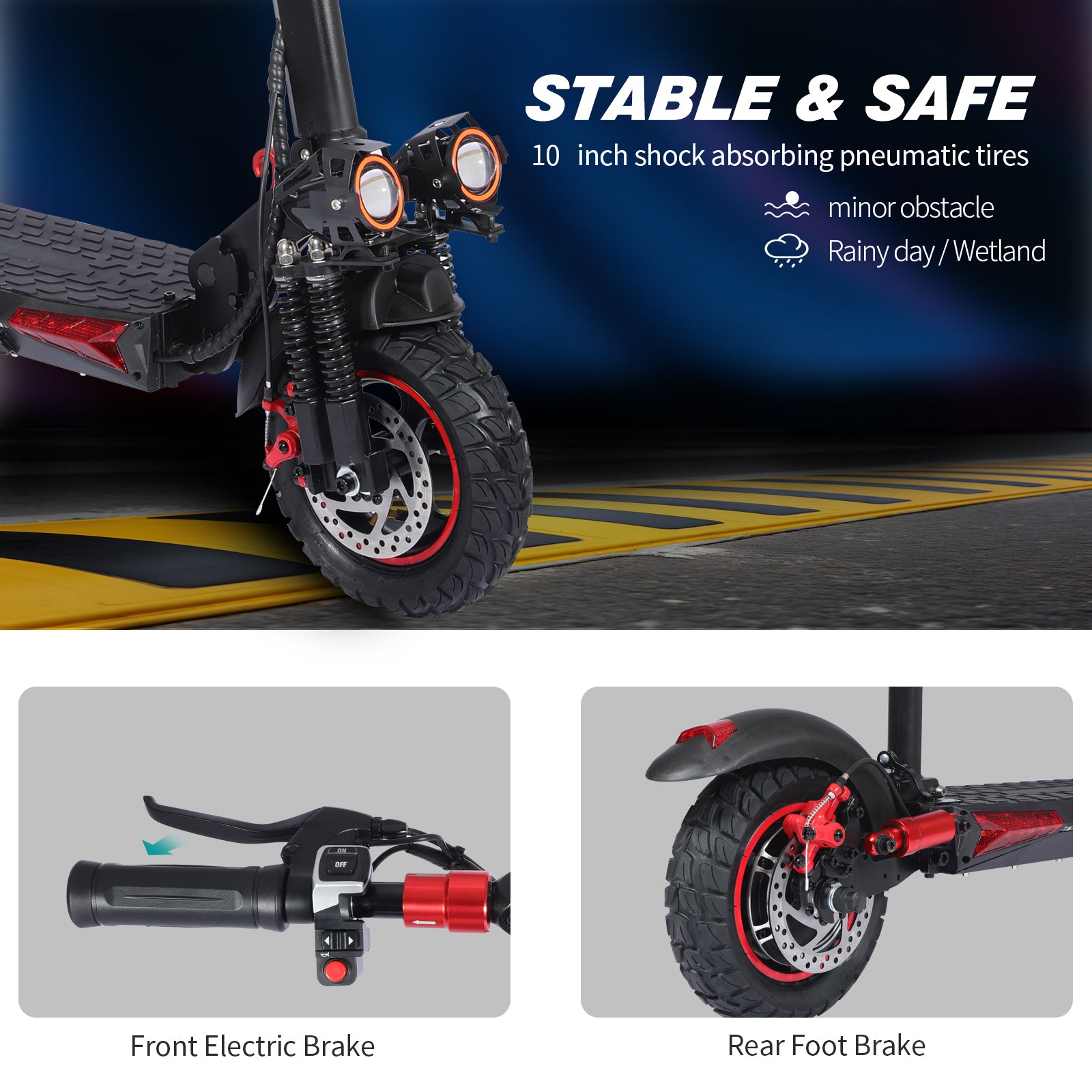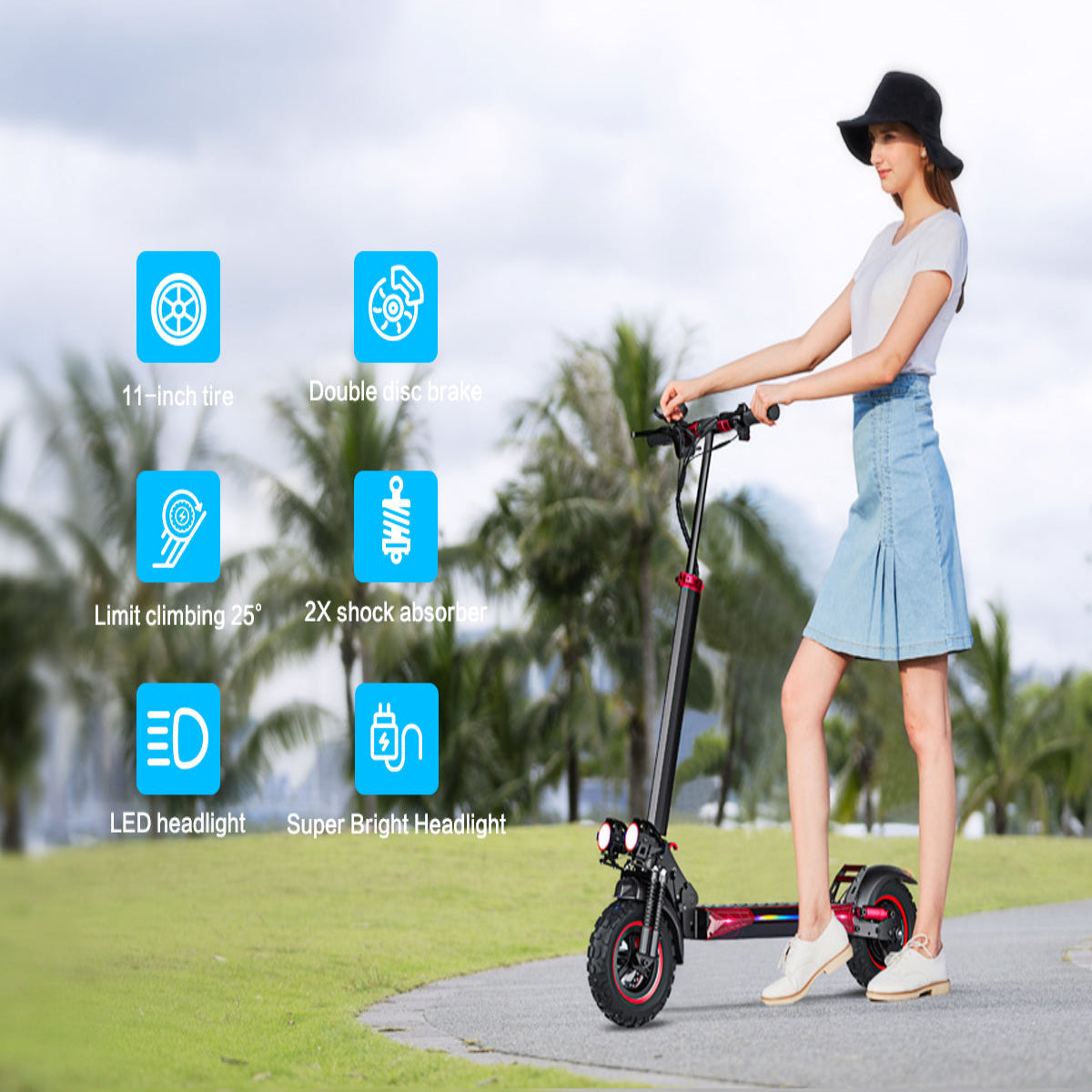 11-Inch Off-Road Tires: Large vacuum off-road tires provide enhanced grip, comfort, and stability across multiple surfaces.